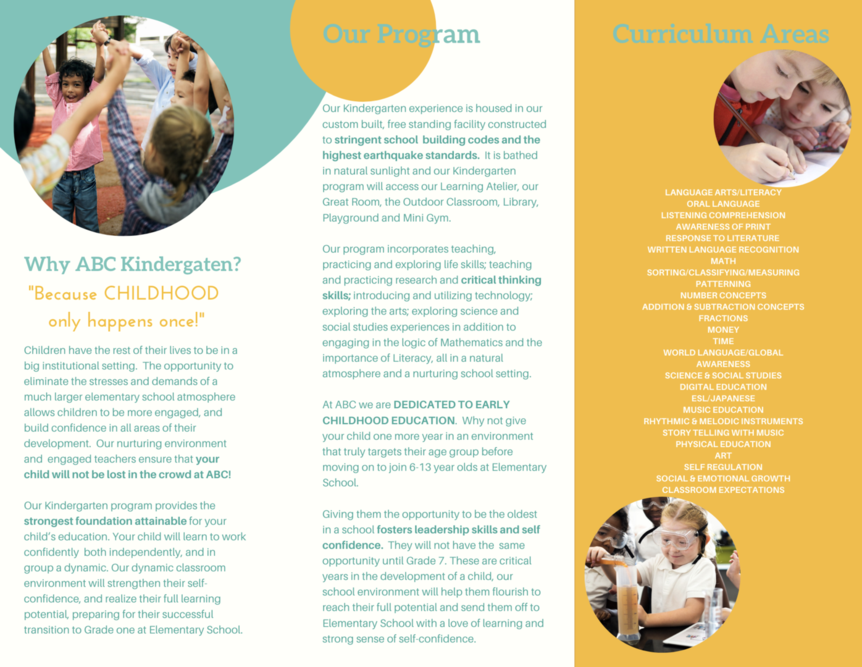 Our Kindergarten program, for children aged 5-6 years old, follows an academic curriculum that includes literacy, reading and writing, mathematics and STEM activities and the arts whilst continuing to develop the ABC aspects of social-emotional development and growth mindset, fostered in the early years. It is the final year of our Sky Group and children join the eldest PreK students to ensure larger group socialization and enjoy activities such as park-time, PE, track, snack, lunch and projects that benefit from multiage groupings together with the 4-5 year olds. Children leave the program fully prepared and ready to enter either International or Japanese Elementary School. There is a strong focus on creating confident communicators and independent thinkers. It is open to children of all nationalities. The Regular Program is from 8:45am - 2:45pm with Extended Day and After School Class Options or children can join for the Full Day 8:45-4:45 or Whole Day 8-5:15pm.